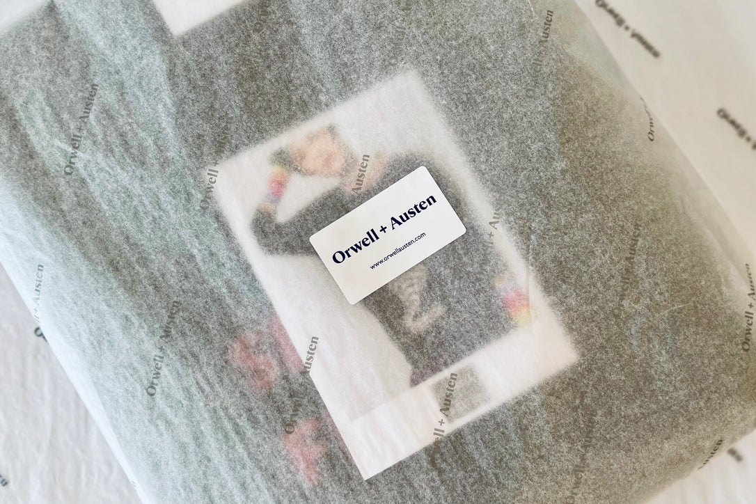 Whilst we are aware that there is a pressure to have more bows and ribbons with products at our price point, we consciously choose to limit our packaging as much as possible in order to minimise waste. Currently, our pieces come wrapped in Orwell + Austen branded recycled tissue paper which goes alongside a recycled paper thank you card inside a biodegradable mailer. We occasionally use a branded recycled gift box (though once we have used all of the boxes from our current order we will not be using the gift boxes going forward).